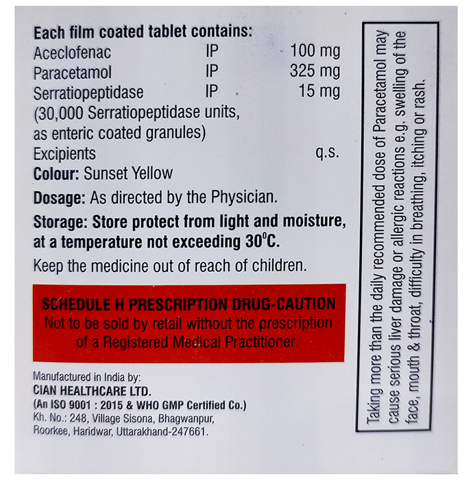 Aceclofenac (100mg) + Paracetamol (325mg) + Serratiopeptidase (15mg)
